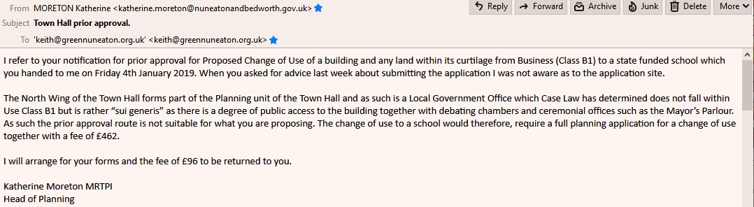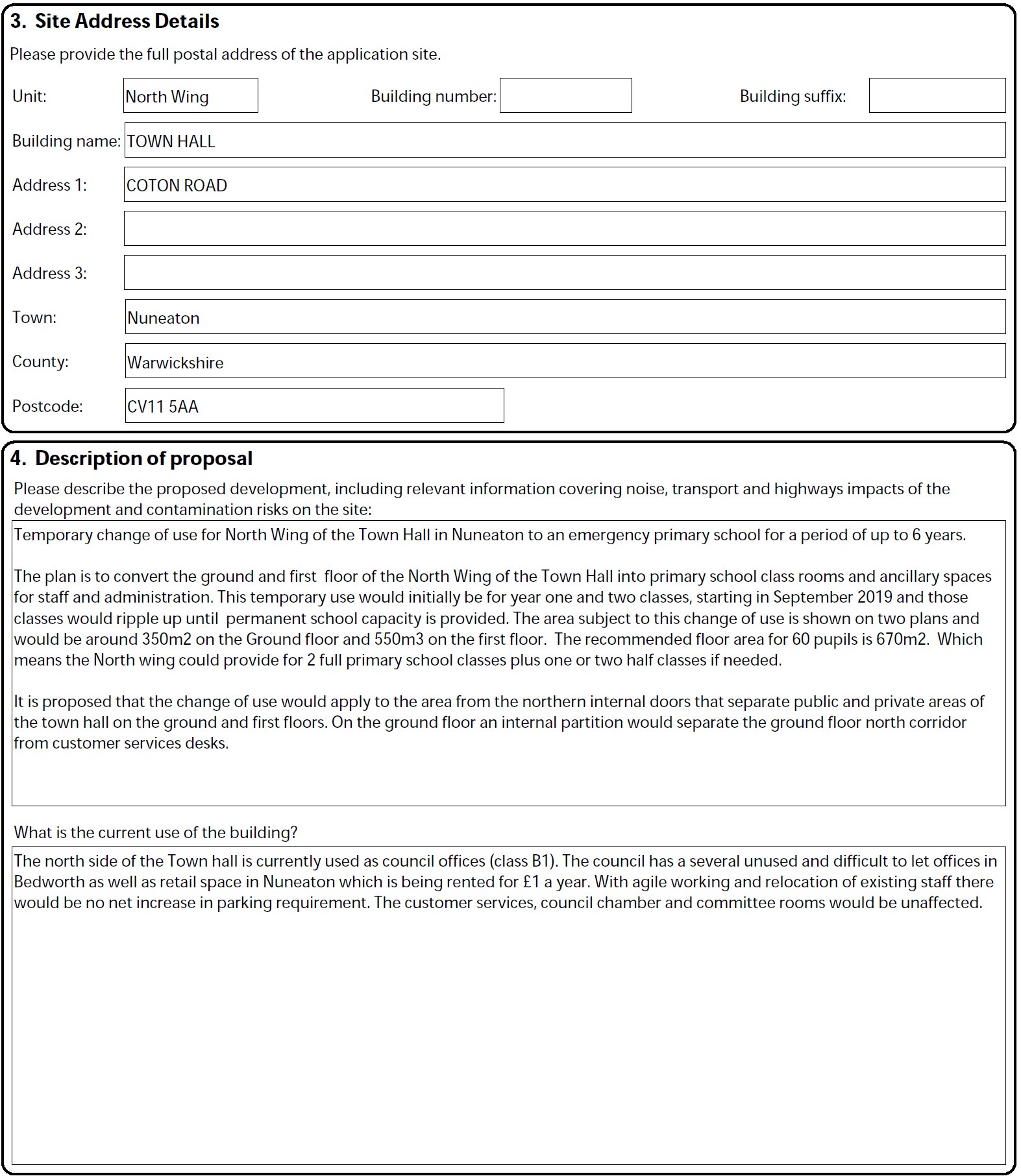 To highlight the issue and provide a possible solution, I have to submitted a “change of use application” to Nuneaton and Bedworth Borough council planners to convert the North Wing of the Town Hall to temporary primary school for the period of up to 6 years.