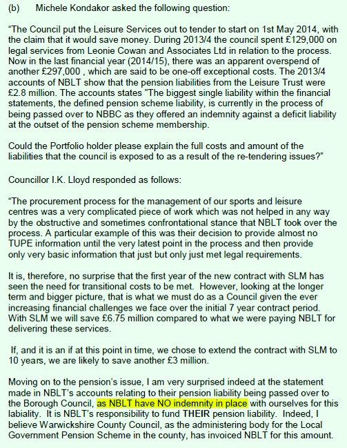 The council seemed to ignore all liability even though it created the situation. It was clear that NBLT could not cover all historic pension liabilities from when staff were providing council services. NBLT public accounts made it clear that it believed NBBC was liable for £2.8m of the deficit. This was not shown in the Borough Council accounts and the Borough seems to have spent £100,000s on the legal mess it created by the arms-lengthening and then re-tendering.