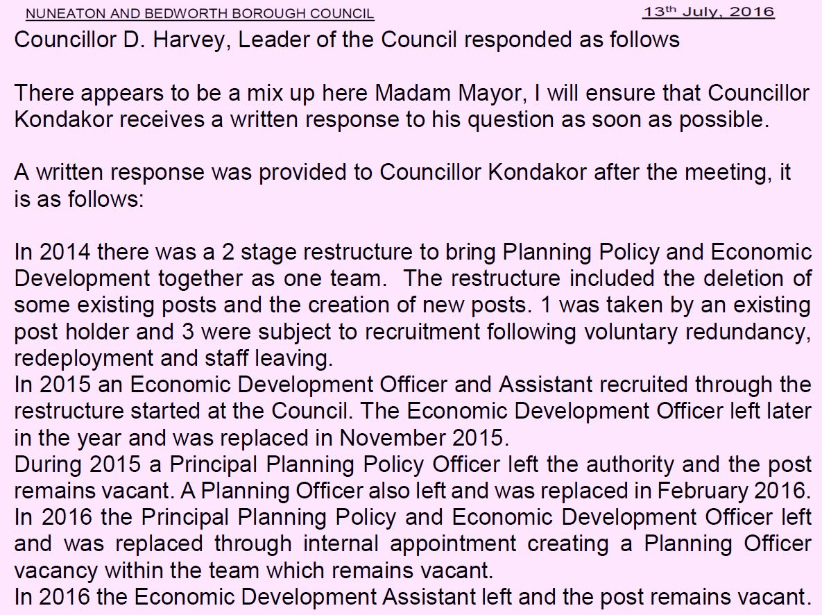 For the last 11 years Nuneaton and Bedworth Borough Council has been working on its new Borough plan. The whole process has been a fiasco and is running EIGHT years late. A sign of how dysfunctional the council has been is the massive staff turnover in Planning policy and economic development
